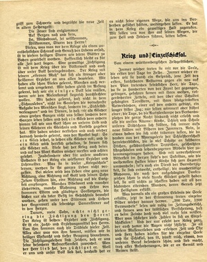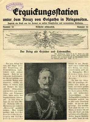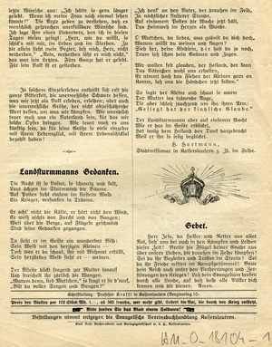 Missionsblatt "Erquickungsstation unter dem Kreuz von Golgatha in Kriegsnöten. Zugleich ein Gruß aus der Heimat an unsere kämpfenden und verwundeten Soldaten". 4-blättriges Missionsblatt der Evangelischen Vereinsbuchhandlung Kaiserslautern. Kein Datum. Schriftleitung: Professor Krafft in Kaiserslautern. Druck: Emil Rohr Buchdruckerei und Verlagsgesellschaft m.b.H., Kaiserslautern.