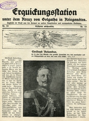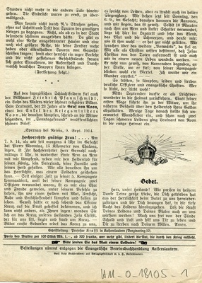 Missionsblatt "Erquickungsstation unter dem Kreuz von Golgatha in Kriegsnöten. Zugleich ein Gruß aus der Heimat an unsere kämpfenden und verwundeten Soldaten". 4-blättriges Missionsblatt der Evangelischen Vereinsbuchhandlung Kaiserslautern. Schriftleitung: Professor Krafft in Kaiserslautern. Druck: Emil Rohr Buchdruckerei und Verlagsgesellschaft m.b.H., Kaiserslautern.