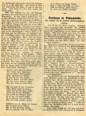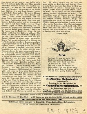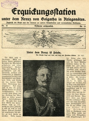 Missionsblatt "Erquickungsstation unter dem Kreuz von Golgatha in Kriegsnöten. Zugleich ein Gruß aus der Heimat an unsere kämpfenden und verwundeten Soldaten". 4-blättriges Missionsblatt der Evangelischen Vereinsbuchhandlung Kaiserslautern. Schriftleitung: Professor Krafft in Kaiserslautern. Druck: Emil Rohr Buchdruckerei und Verlagsgesellschaft m.b.H., Kaiserslautern.
