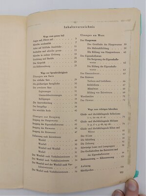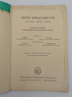 Das Schulbuch "Mein Sprachbuch: Für Saar - Mosel - Lahn. Anweisungen für Stillarbeit und Selbsttätigkeit im muttersprachlichen Unterricht", herausgegeben 1957 vom Herrmann Schroedel Verlag K. G., ist ein Schulbuch, das vermutlich im Deutschunterricht zur Anwendung kam. Das Schulbuch ist in der Ausgabe A in 4 Heften für voll ausgebaute Schulen erschienen, das hier vorliegende Exemplar ist das Heft 3, welches im fünften uns sechsten Schuljahr zur Anwendung kam. Das Buch hat einen orangenen Umschlag aus Pappe und ist in eine grüne Schutzfolie eingeschlagen, vermutlich damit der Umschlag nicht so schnell abnutzt. Auf die erste Seite ist oben mit Bleistift vermutlich der Name der ehemaligen Besitzerin geschrieben: Jngviol (Ingrid?) - Helene Zimmer. Das Buch ist in gutem Zustand erhalten. Auf der Rückseite ist die Bestell-Nr. aufgedruckt, 1813.