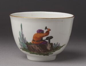 Die Tasse ist mit der Darstellung eines Kupferschmieds oder Kesselflickers bemalt. Die Darstellung steht in der Bildtradition von Stichen und Radierungen zu den so genannten "Cris de Paris". Diese besonders für Paris typischen Straßenhändler, Ausrufer und Anbieter einfacher Dienstleistungen waren insbesondere im 18. Jh. beliebte Motive für ganze Grafikserien. Blattfolgen mit eher idealisierendem Blick auf diese einfache arbeitende Bevölkerung wie etwa von François Boucher oder Edme Bouchardon fanden weite Verbreitung und wurden vielfach kopiert und zitiert. Im 18. wurde das Thema der "Cris de Paris" auch von Porzellanmanufakturen aufgegriffen. Es entstanden sowohl Serien von Porzellanfiguren als auch Tafelservice mit aufgemalten Darstellungen der Pariser Marktschreier. Die Tasse wurde von Johann Georg Lamprecht bemalt. Der angesehene Figurenmaler war von 1766 bis 1772 in Frankenthal und in den 1770er und 1780er Jahren in Wien, Paris und Sèvres tätig. [Johanna Kätzel]