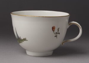 Die Tasse ist mit der Darstellung eines Mannes bemalt, der auf einem Stein sitzt und mit einer Schnur hantiert. Vielleicht repariert oder bindet er gerade etwas oder es handelt sich um einen Verkäufer von Schnürsenkeln. Die Darstellung steht in der Bildtradition von Stichen und Radierungen zu den so genannten "Cris de Paris". Diese besonders für Paris typischen Straßenhändler, Ausrufer und Anbieter einfacher Dienstleistungen waren insbesondere im 18. Jh. beliebte Motive für ganze Grafikserien. Blattfolgen mit eher idealisierendem Blick auf diese einfache arbeitende Bevölkerung wie etwa von François Boucher oder Edme Bouchardon fanden weite Verbreitung und wurden vielfach kopiert und zitiert. Im 18. wurde das Thema der "Cris de Paris" auch von Porzellanmanufakturen aufgegriffen. Es entstanden sowohl Serien von Porzellanfiguren als auch Tafelservice mit aufgemalten Darstellungen der Pariser Marktschreier. Die Tasse wurde von Johann Georg Lamprecht bemalt. Der angesehene Figurenmaler war von 1766 bis 1772 in Frankenthal und in den 1770er und 1780er Jahren in Wien, Paris und Sèvres tätig. [Johanna Kätzel]