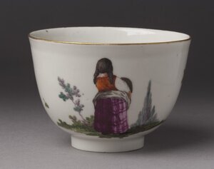 Die Tasse ist mit der Darstellung einer Frau bemalt, die ein Bündel oder einen Sack vor sich trägt. Genaueres kann man nicht erkennen, da sie dem Betrachter den Rücken zuwendet. Die Darstellung steht in der Bildtradition von Stichen und Radierungen zu den so genannten "Cris de Paris". Diese besonders für Paris typischen Straßenhändler, Ausrufer und Anbieter einfacher Dienstleistungen waren insbesondere im 18. Jh. beliebte Motive für ganze Grafikserien. Blattfolgen mit eher idealisierendem Blick auf diese einfache arbeitende Bevölkerung wie etwa von François Boucher oder Edme Bouchardon fanden weite Verbreitung und wurden vielfach kopiert und zitiert. Im 18. wurde das Thema der "Cris de Paris" auch von Porzellanmanufakturen aufgegriffen. Es entstanden sowohl Serien von Porzellanfiguren als auch Tafelservice mit aufgemalten Darstellungen der Pariser Marktschreier. Die Tasse wurde von Johann Georg Lamprecht bemalt. Der angesehene Figurenmaler war von 1766 bis 1772 in Frankenthal und in den 1770er und 1780er Jahren in Wien, Paris und Sèvres tätig. [Johanna Kätzel]