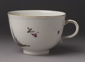 Die Tasse ist mit der Darstellung einer Frau bemalt, die ein Bündel oder einen Sack vor sich trägt. Genaueres kann man nicht erkennen, da sie dem Betrachter den Rücken zuwendet. Die Darstellung steht in der Bildtradition von Stichen und Radierungen zu den so genannten "Cris de Paris". Diese besonders für Paris typischen Straßenhändler, Ausrufer und Anbieter einfacher Dienstleistungen waren insbesondere im 18. Jh. beliebte Motive für ganze Grafikserien. Blattfolgen mit eher idealisierendem Blick auf diese einfache arbeitende Bevölkerung wie etwa von François Boucher oder Edme Bouchardon fanden weite Verbreitung und wurden vielfach kopiert und zitiert. Im 18. wurde das Thema der "Cris de Paris" auch von Porzellanmanufakturen aufgegriffen. Es entstanden sowohl Serien von Porzellanfiguren als auch Tafelservice mit aufgemalten Darstellungen der Pariser Marktschreier. Die Tasse wurde von Johann Georg Lamprecht bemalt. Der angesehene Figurenmaler war von 1766 bis 1772 in Frankenthal und in den 1770er und 1780er Jahren in Wien, Paris und Sèvres tätig. [Johanna Kätzel]