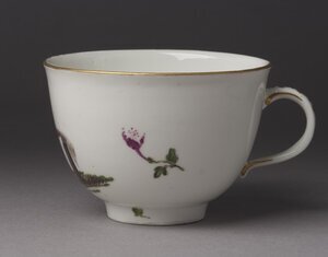 Die Tasse ist mit der Darstellung einer Frau beim Flachskämmen bemalt. Die Darstellung steht in der Bildtradition von Stichen und Radierungen zu den so genannten "Cris de Paris". Diese besonders für Paris typischen Straßenhändler, Ausrufer und Anbieter einfacher Dienstleistungen waren insbesondere im 18. Jh. beliebte Motive für ganze Grafikserien. Blattfolgen mit eher idealisierendem Blick auf diese einfache arbeitende Bevölkerung wie etwa von François Boucher oder Edme Bouchardon fanden weite Verbreitung und wurden vielfach kopiert und zitiert. Im 18. wurde das Thema der "Cris de Paris" auch von Porzellanmanufakturen aufgegriffen. Es entstanden sowohl Serien von Porzellanfiguren als auch Tafelservice mit aufgemalten Darstellungen der Pariser Marktschreier. Die Tasse wurde von Johann Georg Lamprecht bemalt. Der angesehene Figurenmaler war von 1766 bis 1772 in Frankenthal und in den 1770er und 1780er Jahren in Wien, Paris und Sèvres tätig. [Johanna Kätzel]