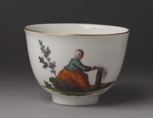 Die Tasse ist mit der Darstellung einer Frau beim Flachskämmen bemalt. Die Darstellung steht in der Bildtradition von Stichen und Radierungen zu den so genannten "Cris de Paris". Diese besonders für Paris typischen Straßenhändler, Ausrufer und Anbieter einfacher Dienstleistungen waren insbesondere im 18. Jh. beliebte Motive für ganze Grafikserien. Blattfolgen mit eher idealisierendem Blick auf diese einfache arbeitende Bevölkerung wie etwa von François Boucher oder Edme Bouchardon fanden weite Verbreitung und wurden vielfach kopiert und zitiert. Im 18. wurde das Thema der "Cris de Paris" auch von Porzellanmanufakturen aufgegriffen. Es entstanden sowohl Serien von Porzellanfiguren als auch Tafelservice mit aufgemalten Darstellungen der Pariser Marktschreier. Die Tasse wurde von Johann Georg Lamprecht bemalt. Der angesehene Figurenmaler war von 1766 bis 1772 in Frankenthal und in den 1770er und 1780er Jahren in Wien, Paris und Sèvres tätig. [Johanna Kätzel]