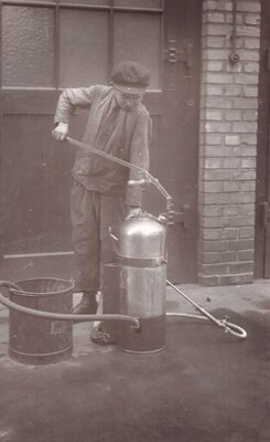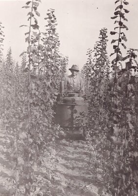 Zu sehen ist ein Behälter für Pestizide. Unten links führt ein Ansaugschlauch hinein. Auf der Rechten Seite ist der Druckschlauch mit der Spritze zu sehen. Durch eine Flügelschraube kann der Spritzdruck dosiert werden. Auf dem Behälter ist ein Hebel zur Druckerzeugung sowie ein Manometer zu sehen. Das Foto stammt aus der ehemaligen Landes-Lehr- und Versuchsanstalt (LLVA) in Bernkastel Kues.