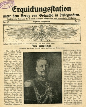 Missionsblatt "Erquickungsstation unter dem Kreuz von Golgatha in Kriegsnöten. Zugleich ein Gruß aus der Heimat an unsere kämpfenden und verwundeten Soldaten". 4-blättriges Missionsblatt der Evangelischen Vereinsbuchhandlung Kaiserslautern. Schriftleitung: Professor Krafft in Kaiserslautern. Druck: Emil Rohr Buchdruckerei und Verlagsgesellschaft m.b.H., Kaiserslautern.