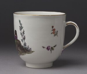 Die Tasse ist mit der Darstellung einer Frau mit Spinnrocken bemalt. Die Darstellung steht in der Bildtradition von Stichen und Radierungen zu den so genannten "Cris de Paris". Diese besonders für Paris typischen Straßenhändler, Ausrufer und Anbieter einfacher Dienstleistungen waren insbesondere im 18. Jh. beliebte Motive für ganze Grafikserien. Blattfolgen mit eher idealisierendem Blick auf diese einfache arbeitende Bevölkerung wie etwa von François Boucher oder Edme Bouchardon fanden weite Verbreitung und wurden vielfach kopiert und zitiert. Im 18. wurde das Thema der "Cris de Paris" auch von Porzellanmanufakturen aufgegriffen. Es entstanden sowohl Serien von Porzellanfiguren als auch Tafelservice mit aufgemalten Darstellungen der Pariser Marktschreier. Die Tasse wurde von Johann Georg Lamprecht bemalt. Der angesehene Figurenmaler war von 1766 bis 1772 in Frankenthal und in den 1770er und 1780er Jahren in Wien, Paris und Sèvres tätig. [Johanna Kätzel]