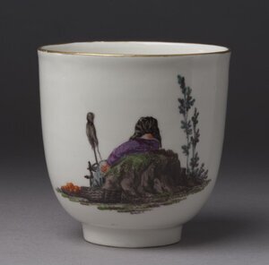 Die Tasse ist mit der Darstellung einer Frau mit Spinnrocken bemalt. Die Darstellung steht in der Bildtradition von Stichen und Radierungen zu den so genannten "Cris de Paris". Diese besonders für Paris typischen Straßenhändler, Ausrufer und Anbieter einfacher Dienstleistungen waren insbesondere im 18. Jh. beliebte Motive für ganze Grafikserien. Blattfolgen mit eher idealisierendem Blick auf diese einfache arbeitende Bevölkerung wie etwa von François Boucher oder Edme Bouchardon fanden weite Verbreitung und wurden vielfach kopiert und zitiert. Im 18. wurde das Thema der "Cris de Paris" auch von Porzellanmanufakturen aufgegriffen. Es entstanden sowohl Serien von Porzellanfiguren als auch Tafelservice mit aufgemalten Darstellungen der Pariser Marktschreier. Die Tasse wurde von Johann Georg Lamprecht bemalt. Der angesehene Figurenmaler war von 1766 bis 1772 in Frankenthal und in den 1770er und 1780er Jahren in Wien, Paris und Sèvres tätig. [Johanna Kätzel]