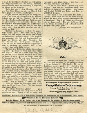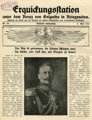 Missionsblatt "Erquickungsstation unter dem Kreuz von Golgatha in Kriegsnöten. Zugleich ein Gruß aus der Heimat an unsere kämpfenden und verwundeten Soldaten". 4-blättriges Missionsblatt der Evangelischen Vereinsbuchhandlung Kaiserslautern. Schriftleitung: Professor Krafft in Kaiserslautern. Druck: Emil Rohr Buchdruckerei und Verlagsgesellschaft m.b.H., Kaiserslautern.