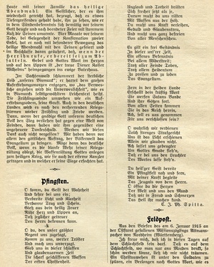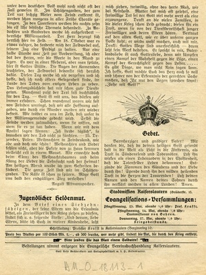 Missionsblatt "Erquickungsstation unter dem Kreuz von Golgatha in Kriegsnöten. Zugleich ein Gruß aus der Heimat an unsere kämpfenden und verwundeten Soldaten". 4-blättriges Missionsblatt der Evangelischen Vereinsbuchhandlung Kaiserslautern (17.-23. Mai 1916). Schriftleitung: Professor Krafft in Kaiserslautern. Druck: Emil Rohr Buchdruckerei und Verlagsgesellschaft m.b.H., Kaiserslautern.