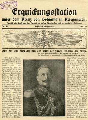 Missionsblatt "Erquickungsstation unter dem Kreuz von Golgatha in Kriegsnöten. Zugleich ein Gruß aus der Heimat an unsere kämpfenden und verwundeten Soldaten". 4-blättriges Missionsblatt der Evangelischen Vereinsbuchhandlung Kaiserslautern (17.-23. Mai 1916). Schriftleitung: Professor Krafft in Kaiserslautern. Druck: Emil Rohr Buchdruckerei und Verlagsgesellschaft m.b.H., Kaiserslautern.