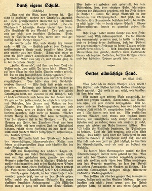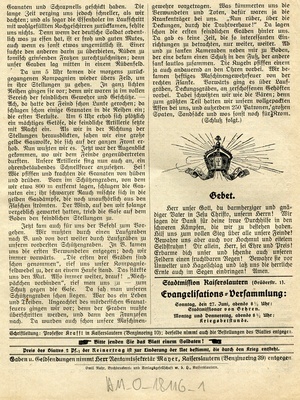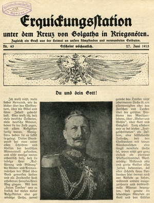 Missionsblatt "Erquickungsstation unter dem Kreuz von Golgatha in Kriegsnöten. Zugleich ein Gruß aus der Heimat an unsere kämpfenden und verwundeten Soldaten". 4-blättriges Missionsblatt der Evangelischen Vereinsbuchhandlung Kaiserslautern (27. Juni 1915). Schriftleitung: Professor Krafft in Kaiserslautern. Druck: Emil Rohr Buchdruckerei und Verlagsgesellschaft m.b.H., Kaiserslautern.