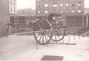Zu sehen ist ein einachsiger Karren, auf den ein Tank montiert ist. Hinter dem Tank befindet sich ein eiserner Sitz, sowie eine hölzerne Box. Der Tank ist per Schlauch mit einer horizontal verlaufenden Stange verbunden. Das im Tank befindliche Pestizid läuft ohne Pumpe aus dem Tank und wird über die Düsen an der Stange versprüht. Das Foto stammt aus der ehemaligen Landes-Lehr- und Versuchsanstalt (LLVA) in Bernkastel Kues.
