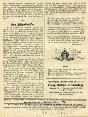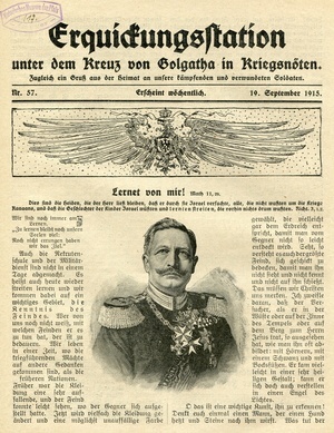 Missionsblatt "Erquickungsstation unter dem Kreuz von Golgatha in Kriegsnöten. Zugleich ein Gruß aus der Heimat an unsere kämpfenden und verwundeten Soldaten". 4-blättriges Missionsblatt der Evangelischen Vereinsbuchhandlung Kaiserslautern (19. September 1915). Schriftleitung: Professor Krafft in Kaiserslautern. Druck: Emil Rohr Buchdruckerei und Verlagsgesellschaft m.b.H., Kaiserslautern.