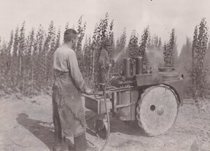 Zu sehen ist ein Arbeiter, der im Weinberg Pestizide ausbringt. Auf dem Rücken trägt er einen großen Tank. Unten am Tank ist ein Schlauch befestigt, in den per Ventil das Pestizid strömt. Der Arbeiter kann nun das Rohr mit der Spritzdüse zielgenau an den Weinstock führen. Das Foto stammt aus der ehemaligen Landes-Lehr- und Versuchsanstalt (LLVA) in Bernkastel Kues.