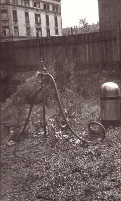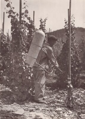 Zu sehen ist ein Arbeiter, der Pestizide im Weinberg ausbringt. Er trägt hierzu einen Tank auf dem Rücken, der per Schlauch wohl mit einer Pumpe und einem weiteren Tank verbunden ist. Der Tank auf dem Rücken ist auch deshalb nicht so groß, da stetig neue Flüssigkeit über den Schlauch ankommt. Das Foto stammt aus der ehemaligen Landes-Lehr- und Versuchsanstalt (LLVA) in Bernkastel Kues.