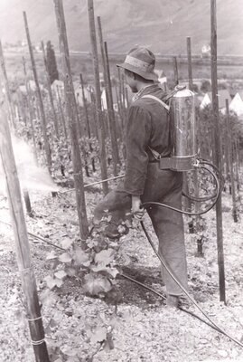 Zu sehen ist ein Arbeiter, der Pestizide im Weinberg ausbringt. Er trägt hierzu einen Tank auf dem Rücken, der per Schlauch wohl mit einer Pumpe und einem weiteren Tank verbunden ist. Der Tank auf dem Rücken ist auch deshalb nicht so groß, da stetig neue Flüssigkeit über den Schlauch ankommt. Das Foto stammt aus der ehemaligen Landes-Lehr- und Versuchsanstalt (LLVA) in Bernkastel Kues.