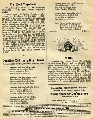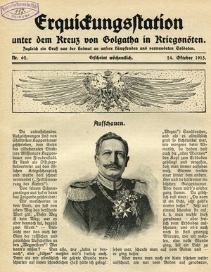 Missionsblatt "Erquickungsstation unter dem Kreuz von Golgatha in Kriegsnöten. Zugleich ein Gruß aus der Heimat an unsere kämpfenden und verwundeten Soldaten". 4-blättriges Missionsblatt der Evangelischen Vereinsbuchhandlung Kaiserslautern (24. Oktober 1915). Schriftleitung: Professor Krafft in Kaiserslautern. Druck: Emil Rohr Buchdruckerei und Verlagsgesellschaft m.b.H., Kaiserslautern.