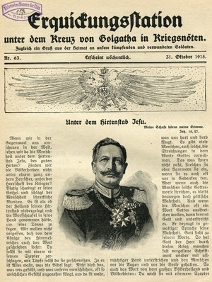 Missionsblatt "Erquickungsstation unter dem Kreuz von Golgatha in Kriegsnöten. Zugleich ein Gruß aus der Heimat an unsere kämpfenden und verwundeten Soldaten". 4-blättriges Missionsblatt der Evangelischen Vereinsbuchhandlung Kaiserslautern (31. Oktober 1915). Schriftleitung: Professor Krafft in Kaiserslautern. Druck: Emil Rohr Buchdruckerei und Verlagsgesellschaft m.b.H., Kaiserslautern.