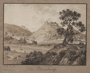 Die Ruine der Burg Ebernburg bei Bad Münster am Stein-Ebernburg im Landkreis Bad Kreuznach vor dem Wiederaufbau im Jahr 1838. Die Sepiazeichnung zeigt die Burg aus einiger Entfernung von einem erhöhten Standpunkt in Bad Münster am Stein aus gesehen. Zwei Repousseoirfiguren und ein großer Baum im Vordergrund verstärken die räumliche Wirkung des Werkes. Der Standort des Künstlers wird durch die Nahe im Mittelgrund vom Burgberg getrennt. Die Arbeit ist bezeichnet mit den Initialen des Künstlers am linken untern Rand: °F.C.R. fec.°. Darunter findet sich der Titel der Zeichnung °Die Ebernburg° (und die Anmerkung °Reinermann° von fremder Hand). Reinermann erhielt seinen ersten Malunterricht bei dem Porträtmaler Cramer in Wetzlar. Danach arbeitete er als Schüler bei dem Frankfurter Künstler Johann Andreas Benjamin Nothnagel (1729–1804). Anschließend war er als Tapetenmaler in Wetzlar tätig. Es folgte 1789 ein Studienaufenthalt in Kassel. Im Jahr 1789 reiste er nach Italien und verbrachte einige Monate in Rom, wo er Schüler von Louis Ducros (1747–1810) war. Reinermann spezialisierte sich auf Aquatintaradierungen. Von 1803 bis 1811 lebte Reinermann in Frankfurt am Main. 1812 wurde er zum "Professor der bildenden Künste" ernannt und erhielt 1818 eine Anstellung als Lehrer an der Kunstschule in Frankfurt am Main.