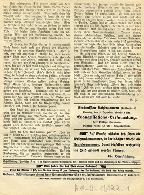 Missionsblatt "Erquickungsstation unter dem Kreuz von Golgatha in Kriegsnöten. Zugleich ein Gruß aus der Heimat an unsere kämpfenden und verwundeten Soldaten". 4-blättriges Missionsblatt der Evangelischen Vereinsbuchhandlung Kaiserslautern (Weihnachts-Nr. 1915). Schriftleitung: Professor Krafft in Kaiserslautern. Druck: Emil Rohr Buchdruckerei und Verlagsgesellschaft m.b.H., Kaiserslautern.