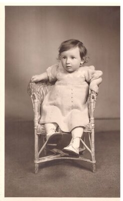 Zu sehen ist ein kleines Mädchen im Fotoatelier. Sie sitzt in einem Korbsessel und hält sich, ein wenig ängstlich, an den Lehnen fest. Sie ist gekleidet mit einem Strickkleidchen mit Puffärmeln. An den Füssen trägt sie hohe Schuhe. Die Haare sind am Ende gelockt und links gescheitelt.