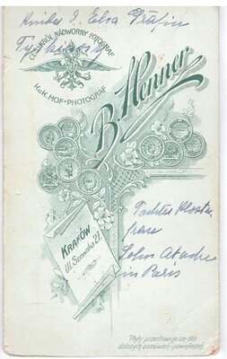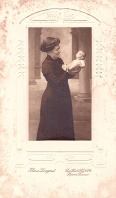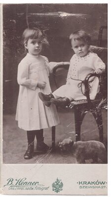 Zu sehen sind Geschwister, die sich zum Fototermin im Atelier befinden. Der Junge sitzt schräg zum Fotografen auf einem Stuhl, und schaut etwas mißtrauisch zum Fotografen. Schräg vor ihm ist ein Spielzeugtier in Form eines Bären auf Rollen aufgestellt. Das Mädchen steht dem Bruder zugewandt, sie schaut aber ebenfalls den Fotografen an. Den rechten Arm hat sie angewinkelt und die Hand zur Faust geballt. Beide Kinder sind weiß gekleidet. Auf der Rückseite des Bildes stehen erklärende Angaben zu den Kindern.
