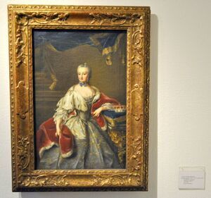 Miniaturdarstellung der Kurfürstin und Gattin Karl Theodors von der Pfalz mit Kurfürstenkrone; ggf. der Vorlage eines Porträts von Johann Georg Ziesenis (1716-1776), das in verschiedenen Kopien und Kupferstichen verbreitet wurde, nachempfunden. Das Gemälde der damals etwa 35-jährigen Kurfürstin befindet sich heute im Schloss Schwetzingen. Miniaturen des Kurfürstenpaars Elisabeth Auguste und Karl Theodor von der Pfalz von Franz Joseph Noortwyck aus dem Jahr 1787 (Aquarell auf Elfenbein) befinden sich im Kurpfälzischen Museum in Heidelberg. Signatur unten rechts. "F.J. Ristru.."