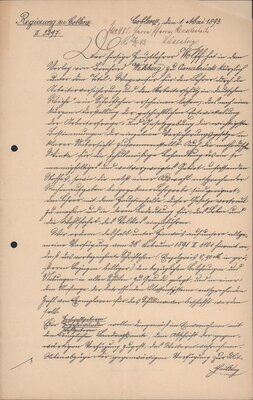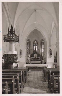 Blick in das Innere des Saalbaus in Neustadt, Das Gebäude wurde in den Jahren 1871 bis 1873 vom Münchener Architekten Albert Geul errichtet. Die Blickrichtung der Darstellung verläuft längs einer Raumschrägen. Der Bildausschnitt zeigt eine Bühne mit Musikinstrument (Flügel) und einen Teil der Fensterfront und der tonnengewölbten Kassettendecke. Das Dekor ist im Neurenaissance-Stil und in den Grundfarben Blau-Rot gehalten. Signatur: A. Croissant, links unten