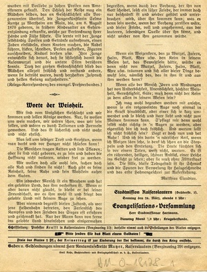 Missionsblatt "Erquickungsstation unter dem Kreuz von Golgatha in Kriegsnöten. Zugleich ein Gruß aus der Heimat an unsere kämpfenden und verwundeten Soldaten". 4-blättriges Missionsblatt der Evangelischen Vereinsbuchhandlung Kaiserslautern (26. März 1916). Schriftleitung: Professor Krafft in Kaiserslautern. Druck: Emil Rohr Buchdruckerei und Verlagsgesellschaft m.b.H., Kaiserslautern.