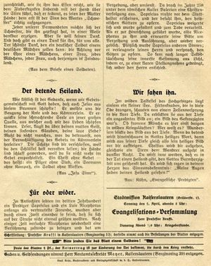 Missionsblatt "Erquickungsstation unter dem Kreuz von Golgatha in Kriegsnöten. Zugleich ein Gruß aus der Heimat an unsere kämpfenden und verwundeten Soldaten". 4-blättriges Missionsblatt der Evangelischen Vereinsbuchhandlung Kaiserslautern (02. April 1916). Schriftleitung: Professor Krafft in Kaiserslautern. Druck: Emil Rohr Buchdruckerei und Verlagsgesellschaft m.b.H., Kaiserslautern.