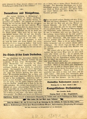 Missionsblatt "Erquickungsstation unter dem Kreuz von Golgatha in Kriegsnöten. Zugleich ein Gruß aus der Heimat an unsere kämpfenden und verwundeten Soldaten". 4-blättriges Missionsblatt der Evangelischen Vereinsbuchhandlung Kaiserslautern (16. April 1916). Schriftleitung: Professor Krafft in Kaiserslautern. Druck: Emil Rohr Buchdruckerei und Verlagsgesellschaft m.b.H., Kaiserslautern.