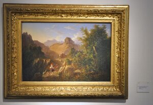 Die kleine Stadt Subiaco mit den Benediktinerklöstern Santa Scolastica und San Benedetto in der rauhen Landschaft der Sabiner Berge hatten schon viele deutschen Künstler zum Motiv erwählt: Johann Christan Reinhart (1793); Josef Anton Koch (1813), Ernst Fries (1830), Karl Blechen (1832), August Anton Tischbein, Carl Morgenstern (1838) um nur einige zu nennen. Die Menge der im frühen 19. Jahrhundert im Gebiet zwischen Tivoli, Palestrina und Subiaco angefertigten Veduten, Zeichnungen, Stiche und Gemälde ist unüberschaubar. Insbesondere Koch, der einige seiner wichtigsten Landschaften in diesem Gebiet gemalt hatte, lockte die Kunstjünger in diese Orte. Fried hält sich zwischen dem 26.9. und dem 8.10. 1835 in Subiaco auf und besucht vor allem das Kloster San Benedetto (Gründung durch Benedikt von Nursia) sowie die Kathedrale und das Kloster San Sciolastica in der Nähe. Das Aquarell von Fried zeigt die Ansicht der um einen Bergkegel herumgebauten Stadt mit der Rocca Abaziale und der Rocca dei Borgia. Seine Ansicht folgt dem Weg zur Stadt, der über die Ponte di San Francesco und ihrem aufragenden Brückenturm führt und dabei das Flüsschen Anio überquert. Die landschaftliche Idylle wird belebt durch figürliche Staffage: ein Eselreiter erzürnt zwei Frauen, die ihm auf der Straße ausweichen müssen, zwei Esel trinken Wasser am Fluss und auch auf der Brücke sind einige Personen unterwegs. Auf einem Fels in der Bildmitte hat der Künstler seine Signatur hinterlassen: ° HFried 1837° (HF ligiert).