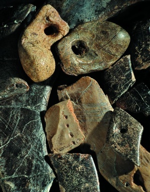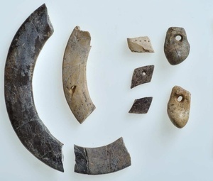 Elfenbeinerne Ringe und Anhänger aus Tierzahn wurden als Schmuckstücke in der jüngeren Altsteinzeit getragen (um 25000 v. Chr.). Gelblich, überwiegend aber braunschwarz erscheinen heute diese kleinen Elfenbeinstücke und Tierzähne, die durch Jahrtausende lange Lagerung in einem Höhlensediment eine Mangan-Patina angenommen haben. Die Ringe aus Mammut-Elfenbein waren einst weiß glänzend, mit Steinwerkzeugen geschnitzt, poliert und mit eingeritzten Strichbündeln sowie gebohrten Punktreihen verziert. Die regelmäßige Herstellung von Körper- und Kleidungsschmuck, ja von Kunstwerken überhaupt, ist eine typische Äußerung des modernen Menschen (Homo sapiens), die früheren Menschenformen weitgehend unbekannt war.