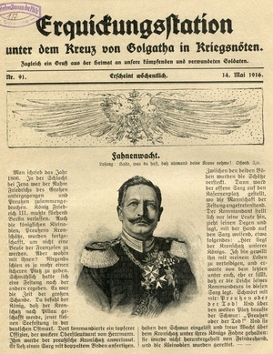 Missionsblatt "Erquickungsstation unter dem Kreuz von Golgatha in Kriegsnöten. Zugleich ein Gruß aus der Heimat an unsere kämpfenden und verwundeten Soldaten"; 4-blättriges Missionsblatt der Evangelischen Vereinsbuchhandlung Kaiserslautern (14. Mai 1916); Schriftleitung: Professor Krafft in Kaiserslautern. Druck: Emil Rohr Buchdruckerei und Verlagsgesellschaft m.b.H., Kaiserslautern;