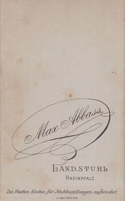 Zu sehen ist ein kleines Kind von ca. 1,5 Jahren. Es steht in einem Fotoatelier zwischen einem Kinderstuhl und einem kleinen Tischchen. Auf die Lehne des Stuhls und auf die Platte des Tisches wird je eine Hand gestützt. Das Kind trägt ein Kleid mit Puffärmeln, welches einen Kragen aus Spitze hat. Schräg vor das Kind hat man ein Spielzeugpferd gestellt. Unter dem Foto sind der Sitz und der Name des Fotoateliers vermerkt.