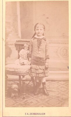 Zu sehen ist ein Mädchen, welches in einem Atelier steht. Das Haar ist zu zwei Zöpfen geflochten. Es steht neben einem Stuhl, des es leicht mit den Fingern an der Sitzfläche berührt. Das Mädchen trägt ein Kleid mit einem gerafften Rock sowie hohe Schuhe. Auf dem Stuhl sitzt eine Puppe. Unter dem Stuhl schaut ein Hund hervor.