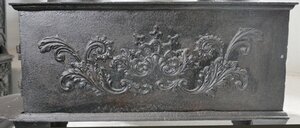 Kolonnenofen aus geschwärztem Eisenguss auf vier schmalen hohen Füßen. Das Besondere an diesem Ofen ist, dass die senkrechen Elemente, duch die der Rauch von einer Etage in die nächst höhere Etage zieht nicht rechteckig sind sonder als runde Säulen gestaltet sind. Die Felder des Ofens sind mit gerennt gegossenen Zierelementen versehen. Der Ofen wurde je nach Geschmack des Kunden und/oder dem aktuellen Zeitgeschmack mit unterschiedlichem Zierelementen ausgeliefert (vgl. hierzu die Abbildungen mehrerre Öfen dieses Typs auf https://www.industrie.lu/usineeich.html ). Auf der untersten Etage es Ofens befindet sich der Brennraum. Befeuert wurde der Ofen in unserer Gegend wohl mit Holz, andernorts auch mit Torf. Die Brennkammer besitzt keinen Rost, sodass mit diesem Ofen nur Holz und Torf, aber keine Kohle verfeuert werden konnte. Was den Etagen- oder Zirkulierofen ausmacht, beginnt sozusagen ein Stockwerk höher. Über zwei Etagen wurden die Rauchgase durch horizontale und vertikale Kanäle, wechselnd rechts und links geführt, die eine optimale Energieausbeute gewährleisten sollten. Durch einen Schieber in der Brennkammertür bestand zudem die Möglichkeit die Luftzufuhr und damit den Abbrand in einem gewissen Rahmen zu regulieren. Hergestellt wurde dieser Ofen von der Société en commandite des Forges d'Eich. Eich ist heute ein Stadtteil von Luxembourg. Er liegt im Norden der Stadt Luxembourg. Um die Rue Eecherschmelz sind noch ein paar Gebäude der ehemaligen Hütte erhaten.
