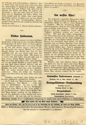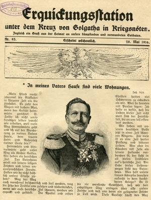 Missionsblatt "Erquickungsstation unter dem Kreuz von Golgatha in Kriegsnöten. Zugleich ein Gruß aus der Heimat an unsere kämpfenden und verwundeten Soldaten"; 4-blättriges Missionsblatt der Evangelischen Vereinsbuchhandlung Kaiserslautern (28. Mai 1916); Schriftleitung: Professor Krafft in Kaiserslautern. Druck: Emil Rohr Buchdruckerei und Verlagsgesellschaft m.b.H., Kaiserslautern;