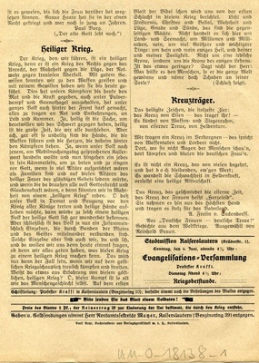 Missionsblatt "Erquickungsstation unter dem Kreuz von Golgatha in Kriegsnöten. Zugleich ein Gruß aus der Heimat an unsere kämpfenden und verwundeten Soldaten"; 4-blättriges Missionsblatt der Evangelischen Vereinsbuchhandlung Kaiserslautern (04. Juni 1916); Schriftleitung: Professor Krafft in Kaiserslautern. Druck: Emil Rohr Buchdruckerei und Verlagsgesellschaft m.b.H., Kaiserslautern.