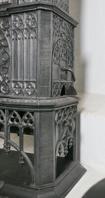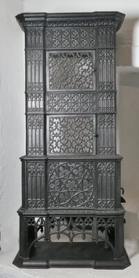 Zirkulierofen aus Eisenguss auf einem ebenfalls gusseisernen Sockel. Der Ofen ist vollständig mit überquellendem Schmuck im Stil des Historismus überzogen. Vergleichsobjekte besitzen oben auf dem Ofen noch eine Krone, die bei diesem Exemplar wohl verloren gegangen ist. Zuunterst befindet sich ein Brennraum. Am Türchen zum Brennraum befindet sich ein Drehgriff mit dem dieser verriegelt werden kann und und darunter eine Klappe zur Regulierung der Luftzufuhr. Dazwischen befindet sich eine Inschrift mit dem Hüttennamen "Eich". Unter dem Brennraum ist ein Rost und unter diesem ein Aschekasten, der mit einem Griff herausgezogen werden kann. Dies hatte in der Regel zur Folge, dass der Ofen nicht nur mit Holz und Torf, sondern auch mit Kohle befeuert werden konnte. Im Gegensatz dazu steht in der Beschreibung eines fast identischen Ofens bei https://www.industrie.lu/usineeich.html , dass es sich hierbei um einen Ofen zur Verbrennung von Holz handelt. In einem Zirkulierofen wurden die Rauchgast über drei Etagen durch horizontale und vertikale Kanäle, wechselnd rechts und links geführt, die eine optimale Enerin der Brennkammertür bestand zudem die Möglichkeit die Luftzufuhr und damit den Abbrand in einem gewissen Rahmen zu regulieren. Hergestellt wurde dieser Ofen von der Société en commandite des Forges d'Eich. Eich ist heute ein Stadtteil im Norden der Stadt Luxemburg. Um die Rue Eecherschmelz sind noch ein paar Gebäude der ehemaligen Hütte erhaten.