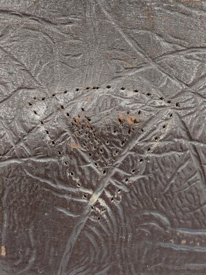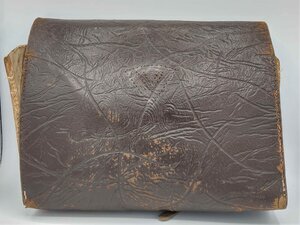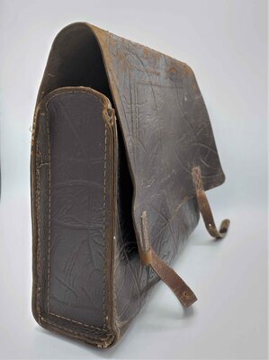 Die Schultasche, oder auch der Schulranzen ist aus dunkelbraunem Leder gefertigt. Sie besaß an der vorderen Unterseite ursprünglich zwei Schnallen an welchen der Deckel geschlossen werden konnte. Diese sind jedoch nicht mehr erhalten, ebenso wenig die Träger der Tasche, die ursprünglich in der Mitte der Rückseite befestigt waren. Die Tasche besitzt auf der Vorderseite ein viereckiges Muster, das noch in groben Zügen erkennbar ist. Der Innenraum der Schultasche besteht aus einem einzigen Fach. Die Schultasche besitzt starke Gebrauchsspuren, die einzelnen Teile der Tasche sind zusammengenäht, jedoch haben sich bereits einige Nähte der Tasche gelöst. Die Tasche besitzt keinerlei Prägung oder Ähnliches, was Aufschluss über den Hersteller geben könnte. Auf der Innenseite der Tasche steht bereits eine ehemalige Inventarisierungsnummer geschrieben: 116-76.