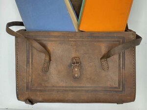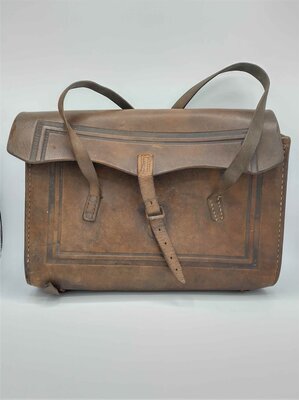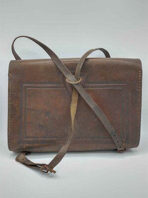 Die Schultasche, oder auch der Schulranzen ist aus dunkelbraunem Leder gefertigt und auf der Vorderseite ist ein viereckiges Muster zu erkennen. Vorne in der Mitte kann der Deckel an einer Schnalle festgemacht werden, die Träger sind an dem Boden der Tasche auf der einen Seite mit einer Schnalle befestigt und auf der anderen Seite kann der Träger einfach ein- und wieder ausgehängt werden. So ließ sich die Tasche leichter an- und wieder ausziehen. Besonders an dieser Tasche ist, dass die Träger nicht auf der Rückseite der Tasche festgemacht sind, sondern dort lediglich durch einen metallenen Ring gezogen sind und über den Deckel der Tasche hinaus gehen, wo sie auf der Vorderseite der Tasche, in Höhe der Deckelschnalle rechts und links festgenäht sind. Das bedeutet, dass die Träger, erst immer nach rechts und links vom Deckel heruntergenommen werden mussten, damit der Deckel geöffnet werden konnte. Der Innenraum der Schultasche besteht aus einem einzigen Fach. Es sind keinerlei Prägungen oder Ähnliches vorhanden, was Aufschluss über den Hersteller geben könnte.