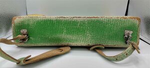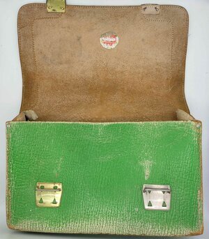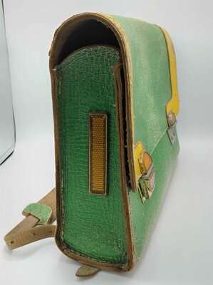 Die Schultasche, oder auch der Schulranzen ist aus grün und gelb gefärbtem Leder gefertigt. Sie besaß vorne ursprünglich zwei Schnapp-Schnallen, die mit runden gelben Reflektoren kombiniert waren und an denen der Deckel der Tasche festgemacht werden konnte, davon ist jedoch eine gebrochen und es ist nur noch die Hälfte der Schnalle vorhanden. An den Seiten der Tasche befindet sich jeweils auch ein länglicher gelber Reflektor. Auf der Rückseite sind die zwei Träger mittig befestigt, sie sind an dem Boden der Tasche auf der einen Seite mit einer Schnalle befestigt und auf der anderen Seite kann der Träger einfach ein- und wieder ausgehängt werden. So ließ sich die Tasche leichter an- und wieder ausziehen. Auch besitzen die Träger lederne Schulterteile, vermutlich damit der Riemen nicht in die Haut schneidet. Der Innenraum der Schultasche besteht aus einem einzigen Fach und man kann dort erkennen, dass die Tasche ursprünglich aus hellbraunem Leder gefertigt ist. Es sind keinerlei Prägungen oder Ähnliches vorhanden, was Aufschluss über den Hersteller geben könnte. Im Inneren des Deckels sind noch die Reste eines glitzernden rot-silbernen Aufklebers vorhanden.