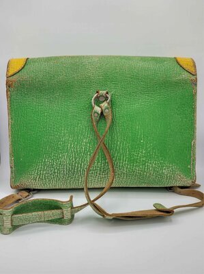 Die Schultasche, oder auch der Schulranzen ist aus grün und gelb gefärbtem Leder gefertigt. Sie besaß vorne ursprünglich zwei Schnapp-Schnallen, die mit runden gelben Reflektoren kombiniert waren und an denen der Deckel der Tasche festgemacht werden konnte, davon ist jedoch eine gebrochen und es ist nur noch die Hälfte der Schnalle vorhanden. An den Seiten der Tasche befindet sich jeweils auch ein länglicher gelber Reflektor. Auf der Rückseite sind die zwei Träger mittig befestigt, sie sind an dem Boden der Tasche auf der einen Seite mit einer Schnalle befestigt und auf der anderen Seite kann der Träger einfach ein- und wieder ausgehängt werden. So ließ sich die Tasche leichter an- und wieder ausziehen. Auch besitzen die Träger lederne Schulterteile, vermutlich damit der Riemen nicht in die Haut schneidet. Der Innenraum der Schultasche besteht aus einem einzigen Fach und man kann dort erkennen, dass die Tasche ursprünglich aus hellbraunem Leder gefertigt ist. Es sind keinerlei Prägungen oder Ähnliches vorhanden, was Aufschluss über den Hersteller geben könnte. Im Inneren des Deckels sind noch die Reste eines glitzernden rot-silbernen Aufklebers vorhanden.