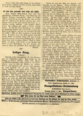 Missionsblatt "Erquickungsstation unter dem Kreuz von Golgatha in Kriegsnöten. Zugleich ein Gruß aus der Heimat an unsere kämpfenden und verwundeten Soldaten". 4-blättriges Missionsblatt der Evangelischen Vereinsbuchhandlung Kaiserslautern (11. Juni 1916); Schriftleitung: Professor Krafft in Kaiserslautern. Druck: Emil Rohr Buchdruckerei und Verlagsgesellschaft m.b.H., Kaiserslautern;