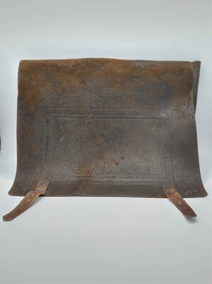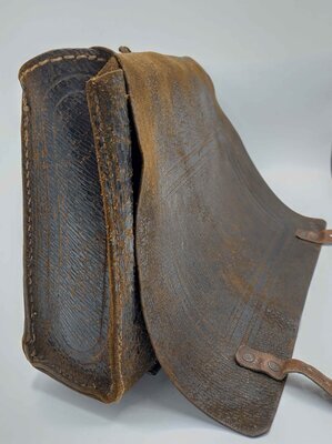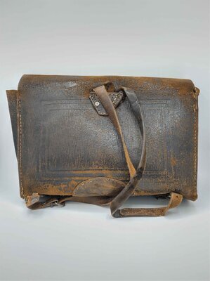 Die Schultasche, oder auch der Schulranzen ist aus dunkelbraunem Leder gefertigt und sie besitzt auf Vorder- und Rückseite je ein viereckiges Muster. Das Leder der Tasche ist sehr weich, was bedeutet, dass die Tasche heute keine starre Form besitzt, sondern von alleine immer wieder zusammenfällt. Es ist schwer zu sagen, ob das schon immer so war, oder ob das Leder mit der Zeit so weich geworden ist. Der Deckel der Tasche wird mit zwei Schnallen am unteren Rand der Vorderseite geschlossen und die Träger sind auf der Rückseite mittig befestigt. Am Boden der Tasche sind sie auf der einen Seite mit einer Schnalle befestigt und auf der anderen Seite kann der Träger einfach ein- und wieder ausgehängt werden. So ließ sich die Tasche leichter an- und wieder ausziehen. Der Innenraum der Tasche besteht aus einem einzigen großen Fach. Es finden sich keinerlei Prägungen oder Aufkleber, die einen Hinweis auf den Hersteller geben.