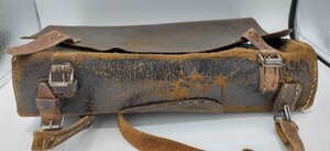 Die Schultasche, oder auch der Schulranzen ist aus dunkelbraunem Leder gefertigt und sie besitzt auf Vorder- und Rückseite je ein viereckiges Muster. Das Leder der Tasche ist sehr weich, was bedeutet, dass die Tasche heute keine starre Form besitzt, sondern von alleine immer wieder zusammenfällt. Es ist schwer zu sagen, ob das schon immer so war, oder ob das Leder mit der Zeit so weich geworden ist. Der Deckel der Tasche wird mit zwei Schnallen am unteren Rand der Vorderseite geschlossen und die Träger sind auf der Rückseite mittig befestigt. Am Boden der Tasche sind sie auf der einen Seite mit einer Schnalle befestigt und auf der anderen Seite kann der Träger einfach ein- und wieder ausgehängt werden. So ließ sich die Tasche leichter an- und wieder ausziehen. Der Innenraum der Tasche besteht aus einem einzigen großen Fach. Es finden sich keinerlei Prägungen oder Aufkleber, die einen Hinweis auf den Hersteller geben.
